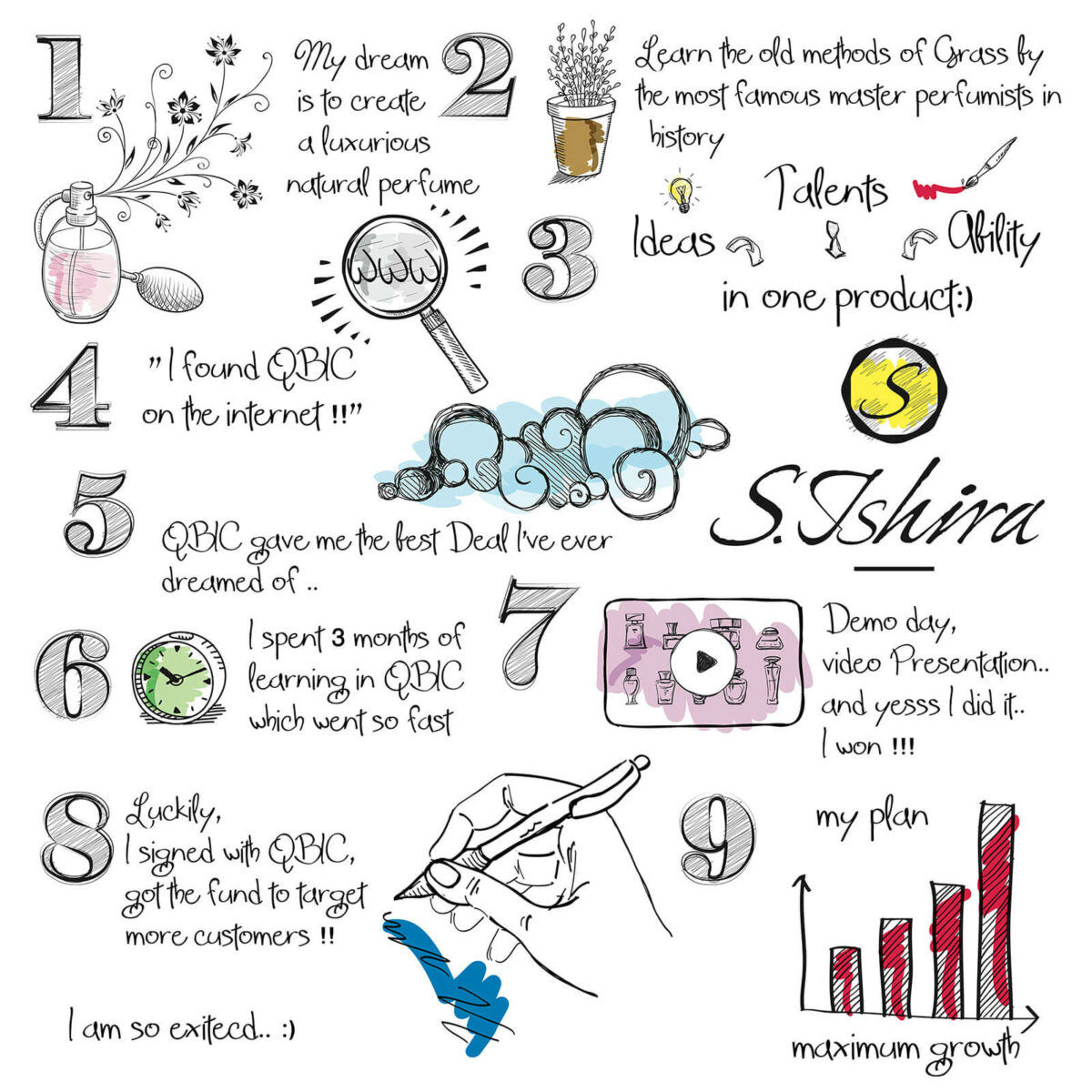 من خلال البحث على الإنترنت وصلت S.Ishira إلى حاضنة قطر للأعمال، التي قدمت لها ما وصفته بأنه أفضل صفقة يمكن أن تحلم بها: التدريب، الفرص، الاتصالات، والمساعدة. أمضت ثلاثة أشهر في التعلم مع الفريق. ومر الوقت بسرعة إلى أن جاء اليوم الذي اضطرت فيه صاحبة المشروع إلى تقديم S.Ishira عن طريق الفيديو للحكّام، ونعم: نجحت وفازت بمكان لها! وبالتالي، وقّعت S.Ishira مع حاضنة قطر للأعمال، وضمنت التمويل لاستهداف المزيد من العملاء.